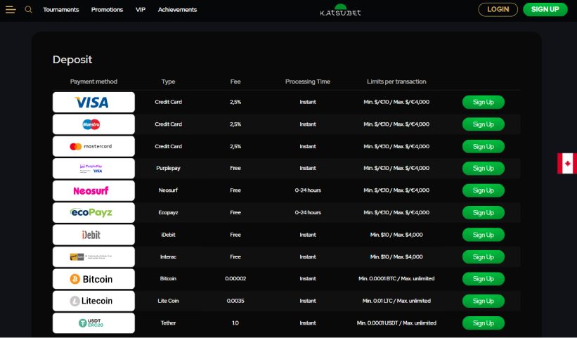 Here is an overview of the deposit and withdrawal methods available at KatsuBet casino:
