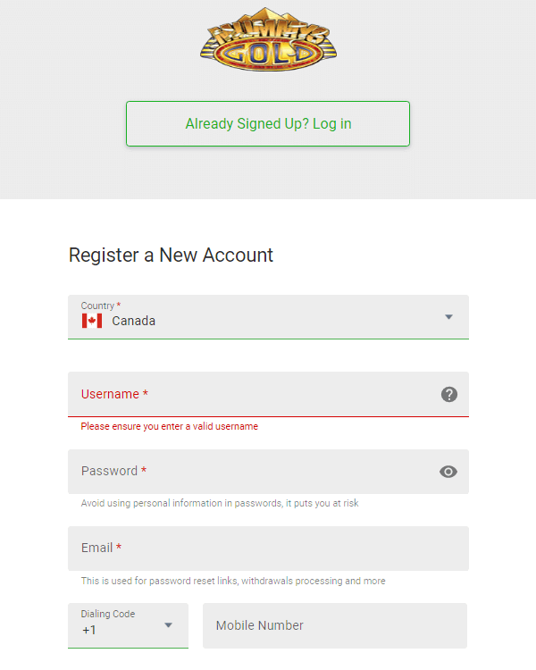 To register oneself on Mummys Gold Casino Canada, the player needs to curate a username, reliant password, administer their email address and factor in their mobile number.
