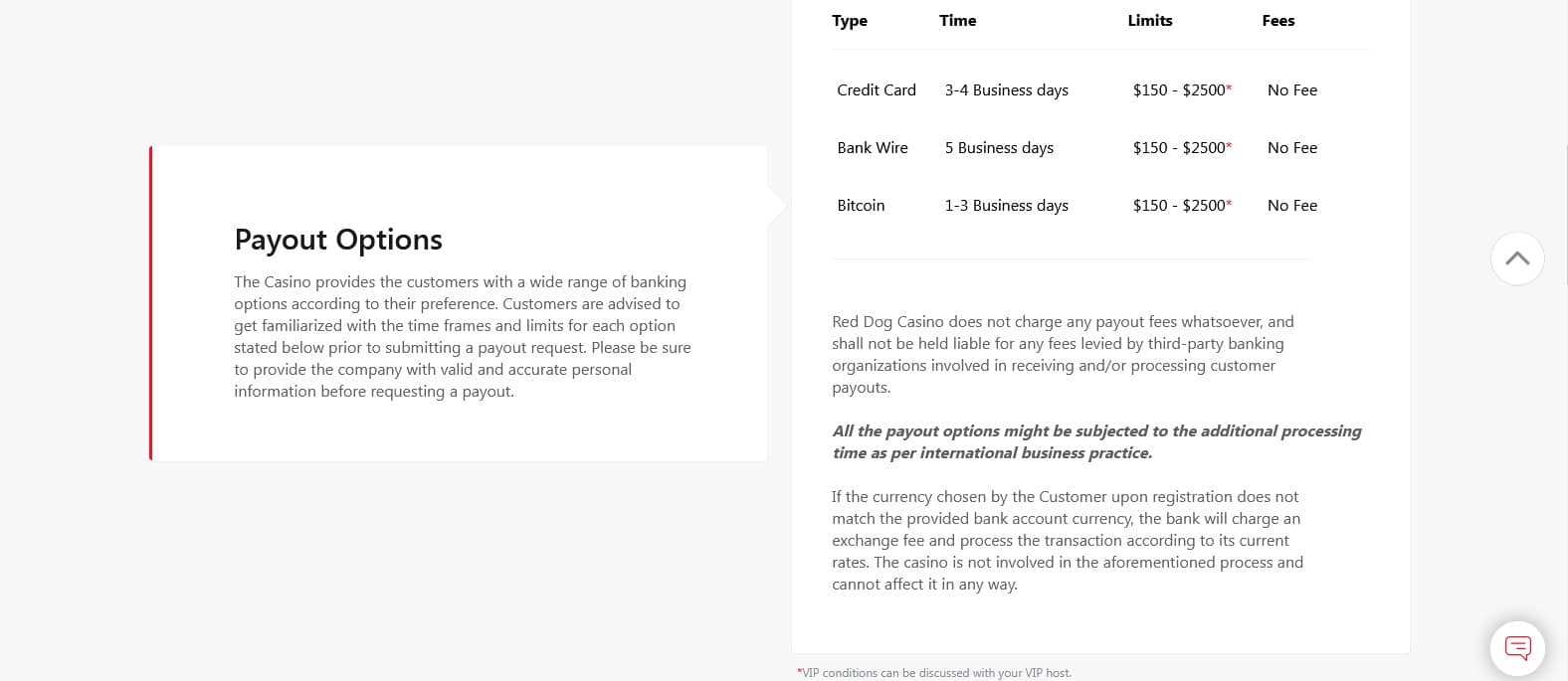 In contrast to the multiple deposit options available at Red Dog there are only 3 withdrawal methods available and the transaction period in all 3 modes is between 1 to 5 days.